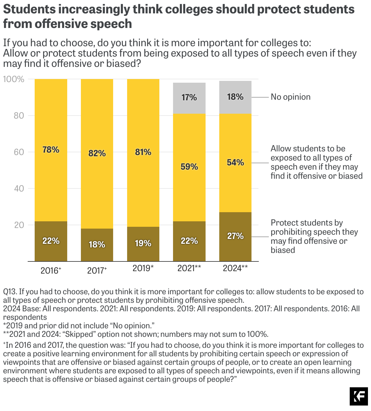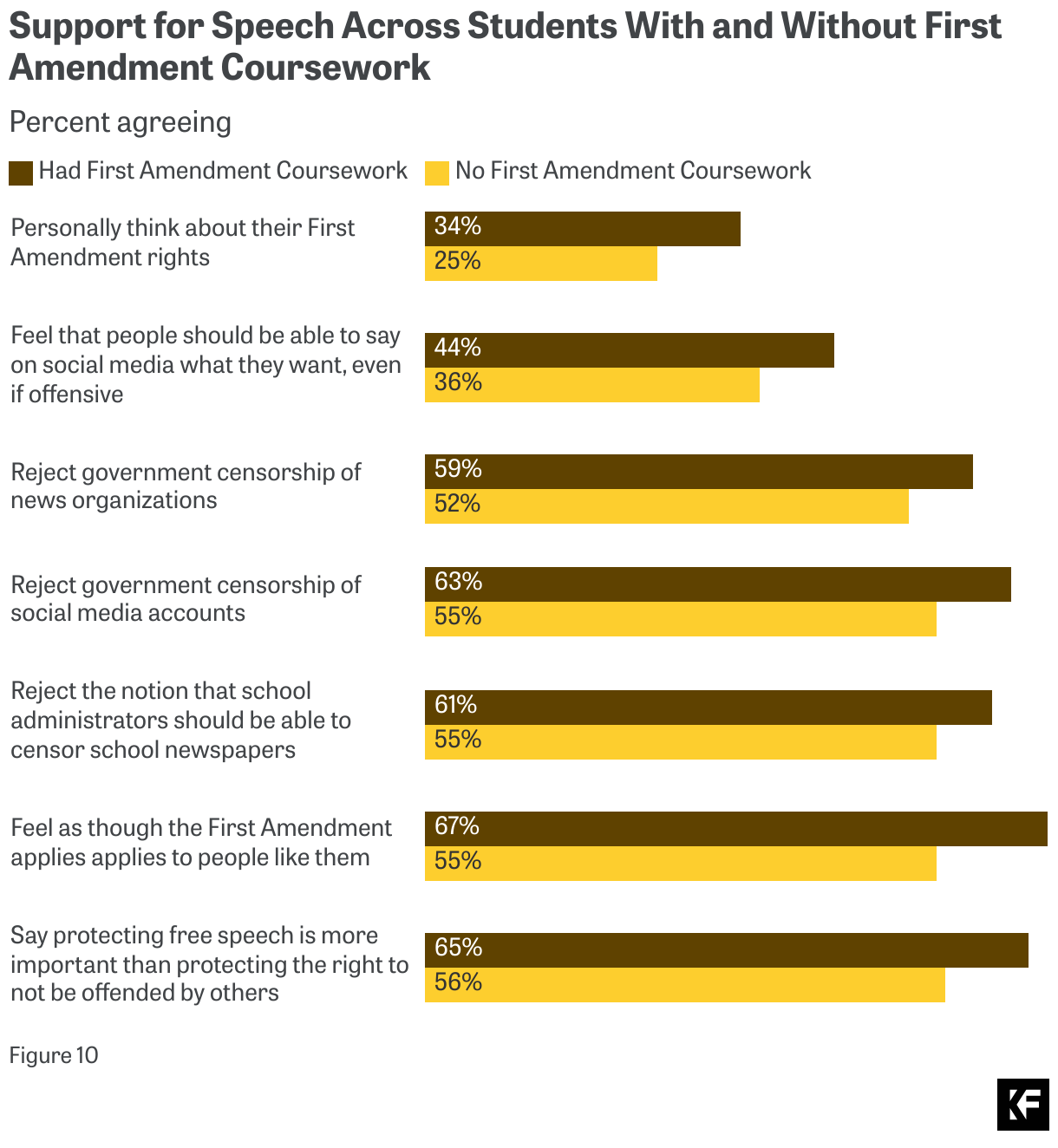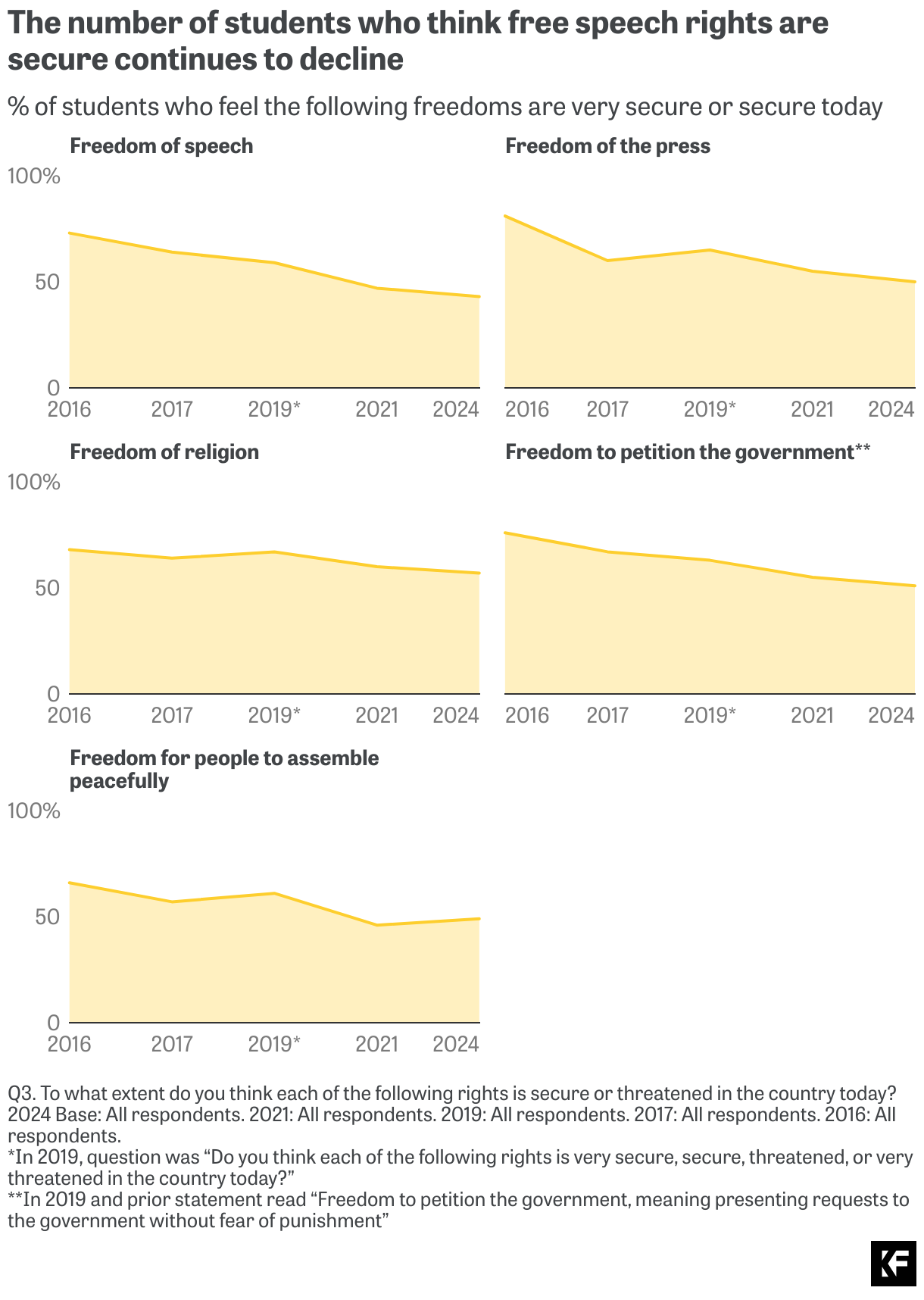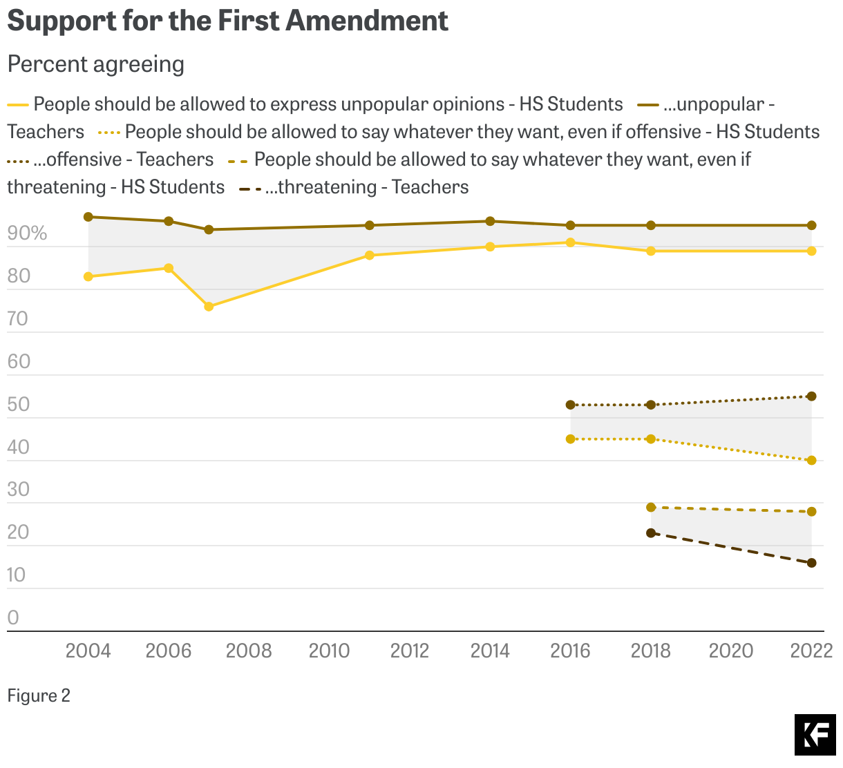 The KFX research series has grown into a robust body of work, illuminating longitudinal trends in attitudes toward free speech issues. With a focus on understanding high school and college students’ views of the First Amendment, this research provides policymakers and education leaders with insights to inform their campus environments and prepare the next generation to actively participate in our democracy. It also offers insights into the future attitudes around this important topic.