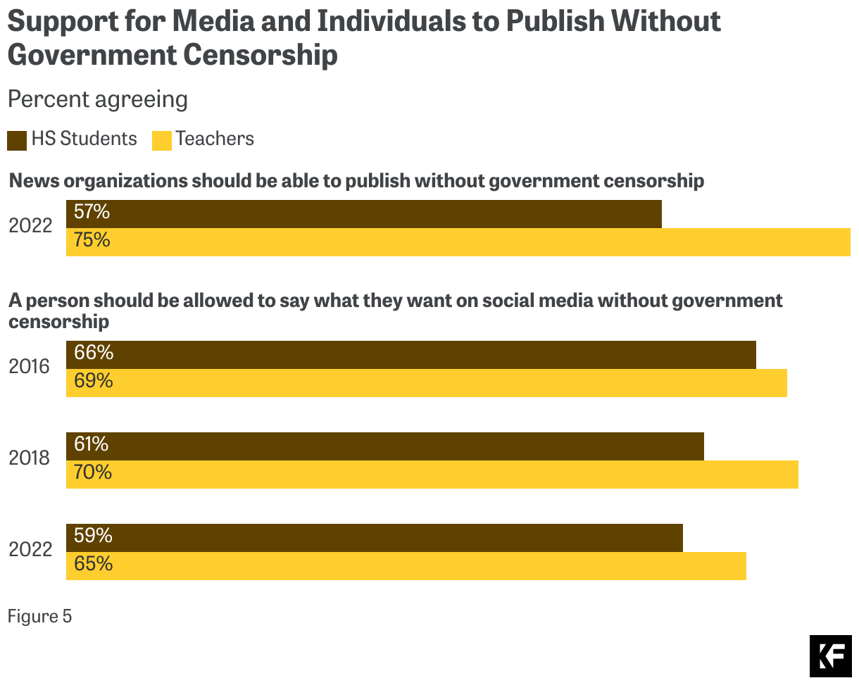 There is steady support for the First Amendment among students and teachers since we began this research in 2004. Students and teachers overwhelmingly agree that people should be allowed to express unpopular opinions, a finding that has been consistent for nearly two decades. Importantly, education on the First Amendment is directly correlated to student support for free speech. That said, less than 60% of students support news organizations publishing without government censorship.