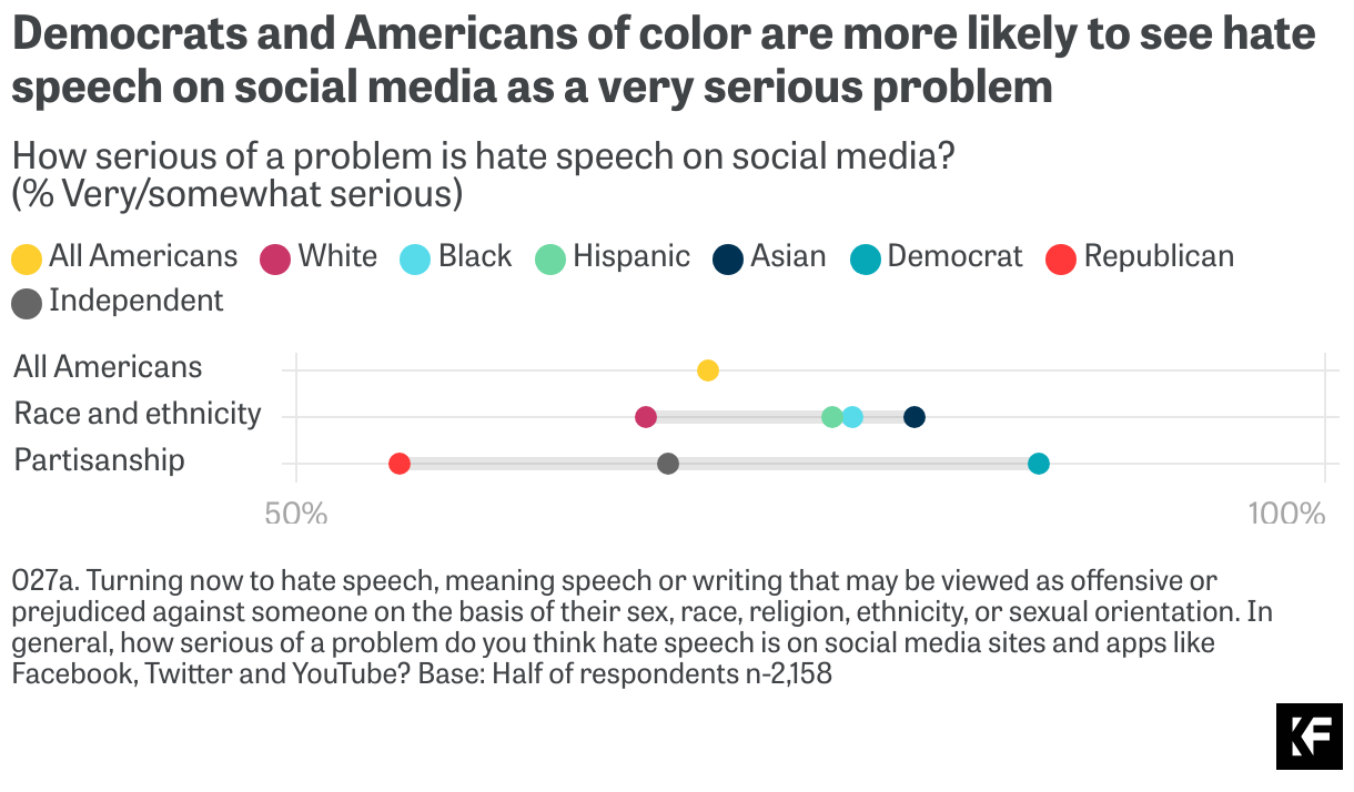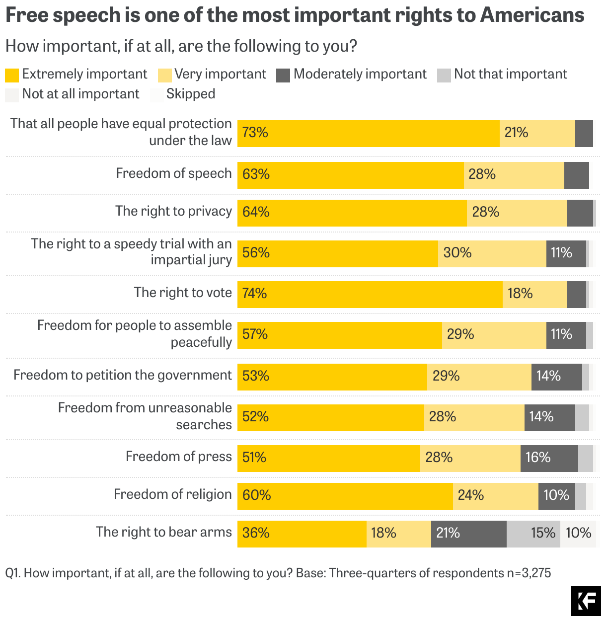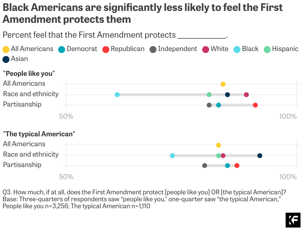 Americans across many demographics appreciate freedom of speech and recognize its benefits to society and democracy. While most Americans feel they enjoy First Amendment protections around their speech rights, some groups––such as Black Americans––feel notably less secure. Additionally, 70% of Americans say that hate speech on social media is a serious problem. For the 2021 “Free Expression in America Post-2020” report, Knight Foundation commissioned Ipsos to conduct a survey with a nationally representative sample of more than 4,000 American adults, including an additional sample of 1,000 undergraduate college students.